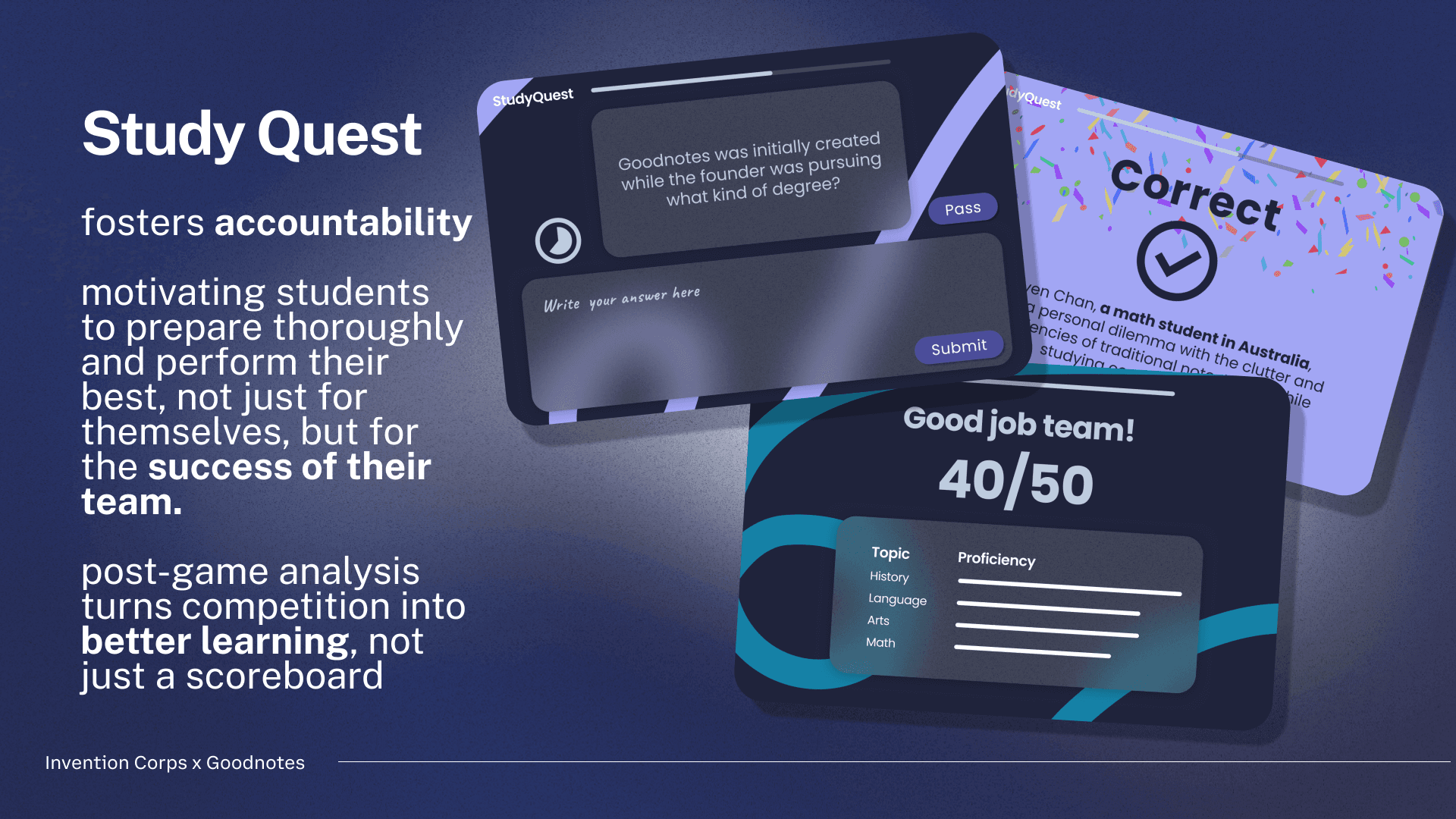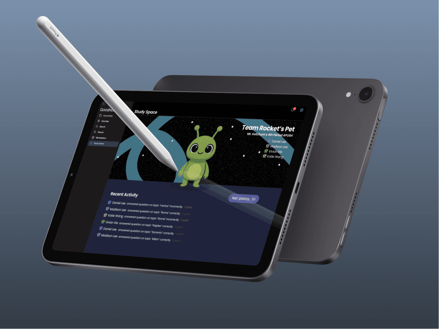 Goodnotes StudySpace was created during a five-hour designathon, where our team explored how Goodnotes could support the future of classroom collaboration. Through quick user interviews with students and teachers, we identified gaps in communication, coordination, and student-to-student engagement. We set out to design a more open, interactive environment that helps students feel connected and confident when working together.